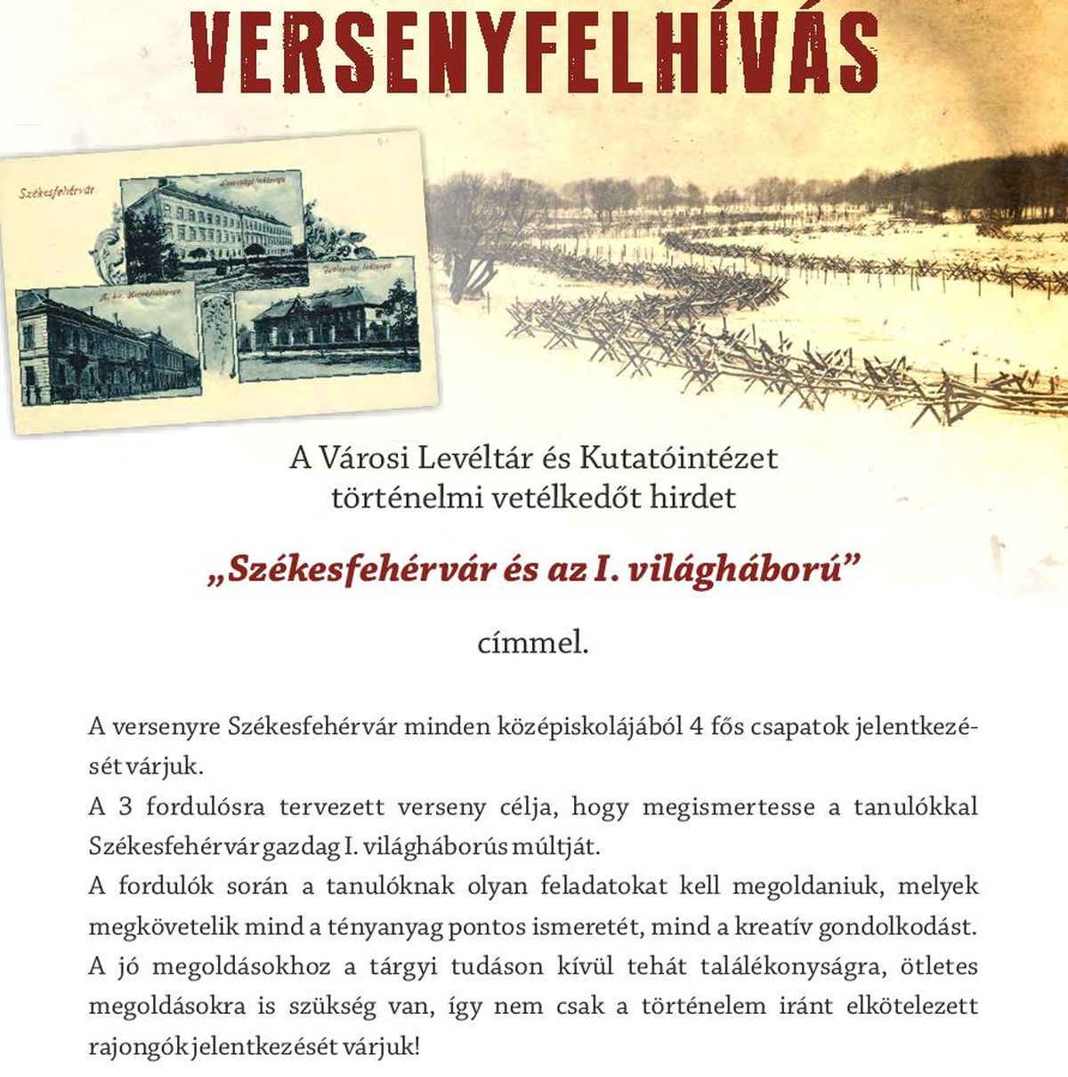 A Városi Levéltár és Kutatóintézet tavaly indította el első világháborús programsorozatát, melyet bővíteni szeretne a középiskolásoknak szóló versennyel. A háromfordulós tudáspróba célja, hogy megismertesse a fiatalokat Székesfehérvár gazdag első világháborús múltjával, katonai és kulturális értékeivel. A különböző fordulók során a tanulóknak – a tényanyag visszaadásán kívül – számot kell adniuk ötletességükről, kreativitásukról is. A szervezők arra törekedtek, hogy a diákok találékonyságára bízzák a feladatok megoldását. A verseny első két fordulójában a csapatoknak előre megadott feladatok alapján kell dolgozniuk, az utolsó fordulóban a legjobb csapatok mérhetik össze tudásukat és ügyességüket. A beküldött munkák elbírálását neves szakemberek végzik majd. A verseny döntőjére 2016. április 27-én a Hiemer-házban kerül sor.