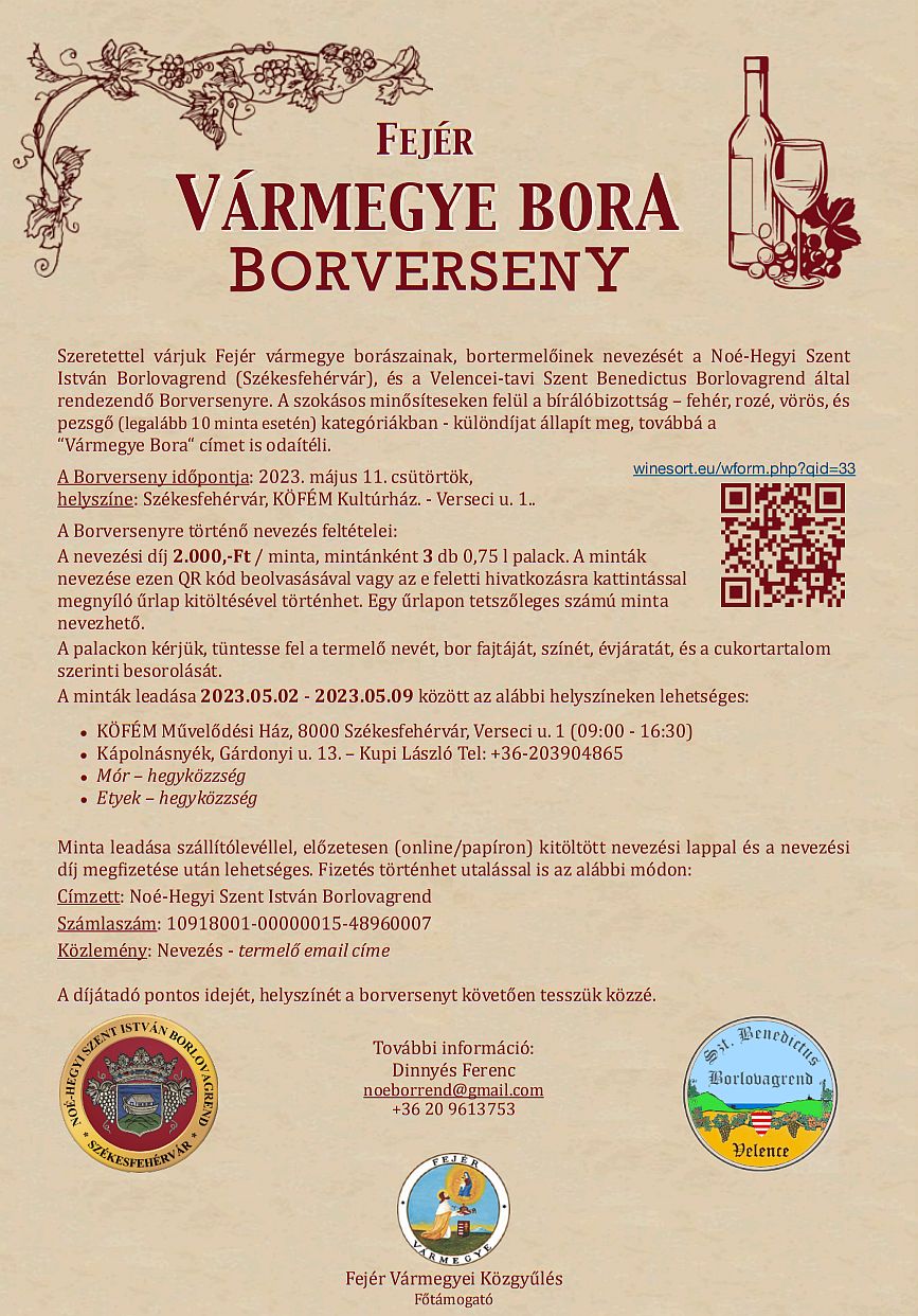 Dinnyés Ferenc, a Noé-hegyi Szent István Borlovagrend elnök-nagymestere a verseny részleteiről szólt. A szokásos minősítéseknek megfelelően bírálják a borokat fehér, rozé, vörös és pezsgő kategóriában legalább 10 minta esetén, ezen kívül különdíjat is megállapítanak, továbbá egy bor a „Fejér Vármegye Bora” címet is elnyerheti. A minták nevezése a https://winesort.eu/pages/W2Q_form.php?qid=33 űrlap kitöltésével is történhet, egy űrlapon tetszőleges számú minta nevezhető. A mintákat május 2-a és május 9-e között több helyszínen, így a KÖFÉM Művelődési Házban, Kápolnásnyéken, a Gárdonyi utca 13. szám alatt Kupi Lászlónál (+3620/3904865), illetve a móri és etyeki hegyközségeknél is le lehet adni. A nevezési díj mintegy 2000 forint lesz mintánként.