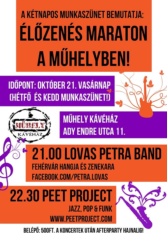 Október 21-én, vasárnap este 9 órától Fehérvár két büszkesége, a Fehérvár Hangja verseny győztese, Lovas Petra és zenekara valamint az immár stílusában világhírű Peet Project ad koncertet a Műhely Kávéház színpadán. A Lovas Petra Band koncertműsora a legismertebb mai slágerek rendkívül dinamikus feldolgozásait tartalmazza, a Peet Project saját dalain kívül a pedig funky és pop klasszikusok átdolgozásaival örvendezteti majd a közönséget.
