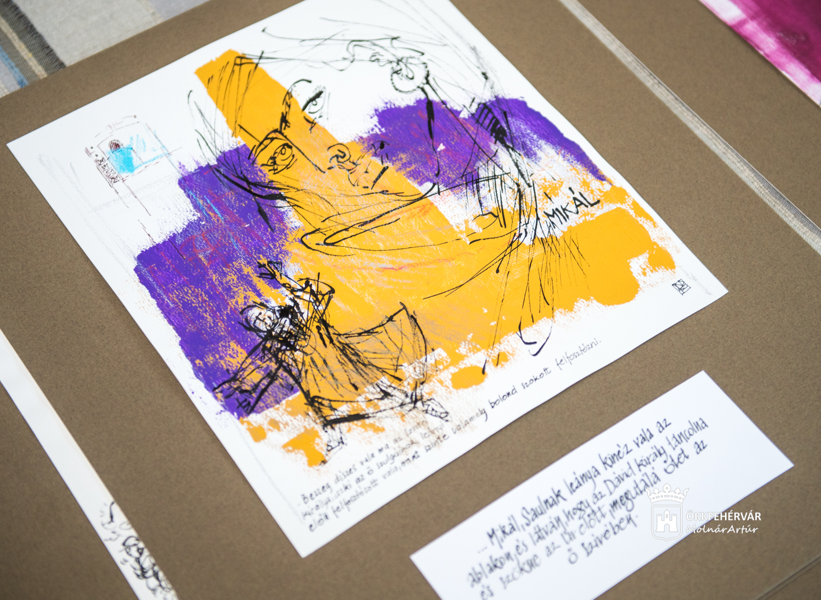 Volt egy köteg különböző minőségű papírom, köztük egészen vékonyak, vastagabbak, akvarellpapírok is, az egyik fehérebb, a másik szürkébb vagy sárgább – amiket lealapoztam. A temperától kezdve az akrill alapozásig mindenféle előfordul: izgatott, hogy maguk ezek az alapok mennyire inspirálnak, adnak-e valami olyan löketet, ami folytatásra ösztönöz. Rengeteg arany van benne például. A rajzok nádtollal készültek, amit nem lehet javítgatni: vagy elsőre sikerül, vagy nem sikerül, úgyhogy egy csomót kidobtam – negyvenkét darabot tartottam meg belőlük. Van, amire utólag is rámentem, például erre olajpasztellel – mutatja az Ézsau című képet.