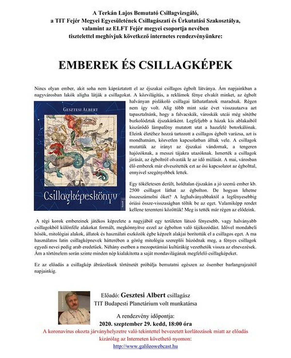A Terkán Lajos Bemutató Csillagvizsgáló, a TIT Fejér Megyei Egyesületének Csillagászati és Űrkutatási Szakosztálya, valamint az ELFT Fejér megyei csoportja szervezésében szeptember 29-én, kedden 18 órakor kezdődik Gesztesi Albert csillagász, a Planetárium volt munkatársa „Emberek és csillagképek” című előadása A járványhelyzetre való tekintettel bevezetett korlátozások miatt az előadás kizárólag interneten követhető.
