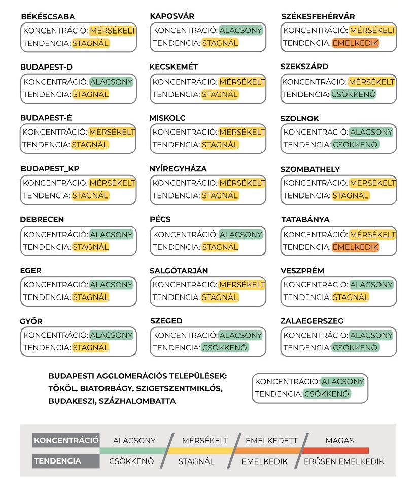 Országos szinten tovább csökkent a koncentráció: Szegeden, Szolnokon és Zalaegerszegen alacsony szint mellett csökkenő a tendencia, Veszprémben és Pécsett például alacsony koncentrációról és stagnáló tendenciáról tájékoztatnak. Székesfehérvárhoz hasonlóan enyhe emelkedés tapasztalható Tatabányán is.