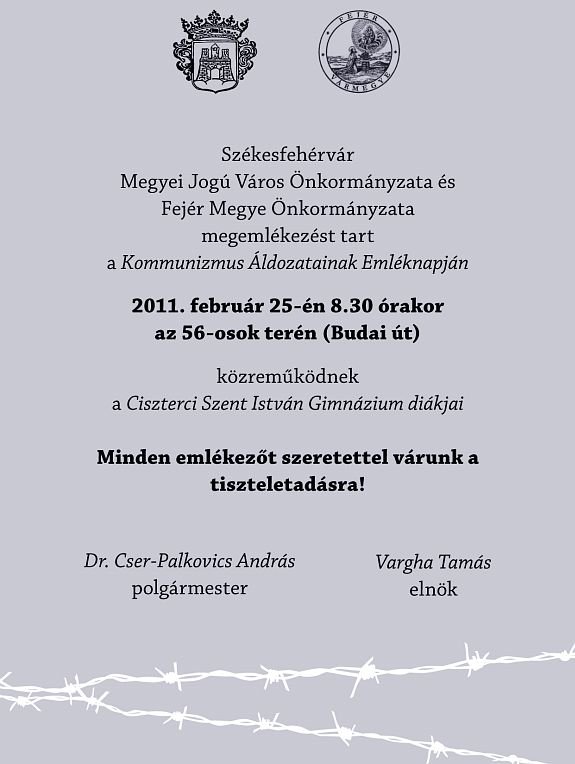 Székesfehérvár és Fejér Megye Önkormányzata közös megemlékezést tart a Kommunizmus Áldozatainak Emléknapján, február 25-én, péntken 8:30-kor az 56-osok terén (Budai út - József Attila utca kereszteződése). A programon közreműködnek a Ciszterci Szent István Gimnázium Diákjai. Minden érdeklődőt szeretettel várnak a megemlékezésre.
