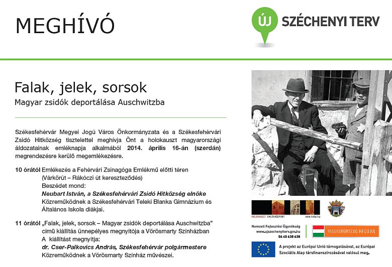A Holokauszt Magyar Áldozatainak Emléknapján koszorúzást tartanak Fehérváron a Zsinagóga Emlékműnél, április 16-án, szerdán, délelőtt 10 órakor. Az eseményen Neubart István, a Székesfehérvári Zsidó Hitközség elnöke mond beszédet. A megemlékezés után 11 órától a „Falak, jelek, sorsok – Magyar zsidók deportálása Auschwitzba” című kiállítás ünnepélyes megnyitójára kerül sor a Vörösmarty Színházban. A kiállítást dr. Cser-Palkovics András polgármester nyitja meg.