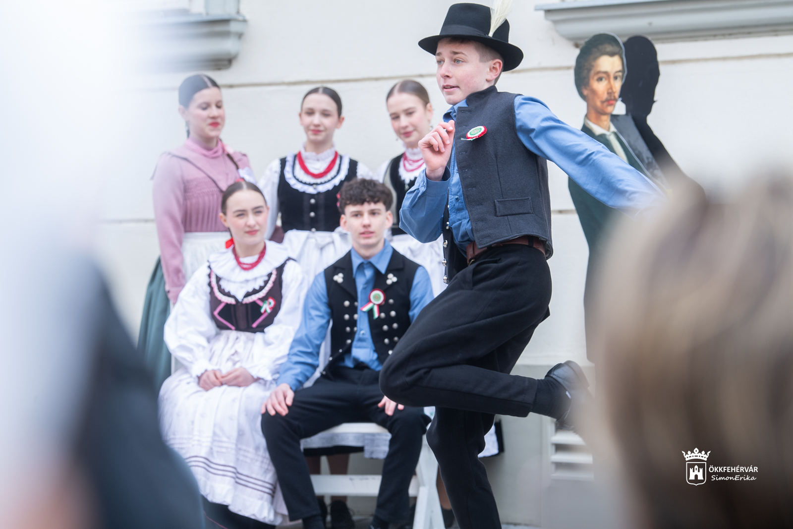 A tiszteletadást követően, a déli harangszó után az Alba Regia Alapfokú Művészeti Iskola ifjú táncosai idézték fel a 177 évvel ezelőtti toborzó hangulatát a Városház téri emelvényen és a nézők között.