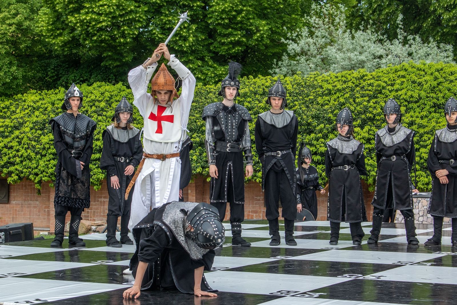 A 100 négyzetméteres sakktáblán bemutatott történelmi játék nemcsak látványában, de vokális zenei megszólalásában is egyedülálló élményt nyújtott a szép számban megjelent nézőknek.