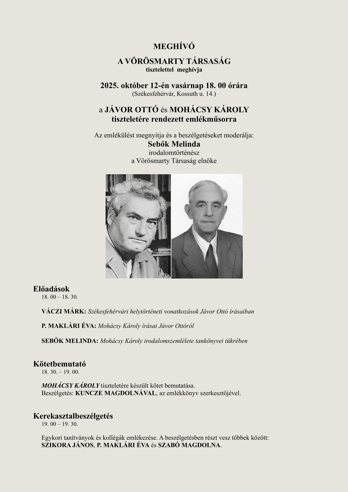 Október 12-én, vasárnap 18 órától emlékműsorral tiszteleg a száz esztendeje született Jávor Ottó és Mohácsy Károly munkássága előtt a Vörösmarty Társaság.