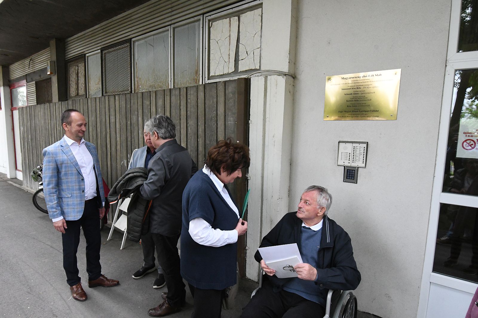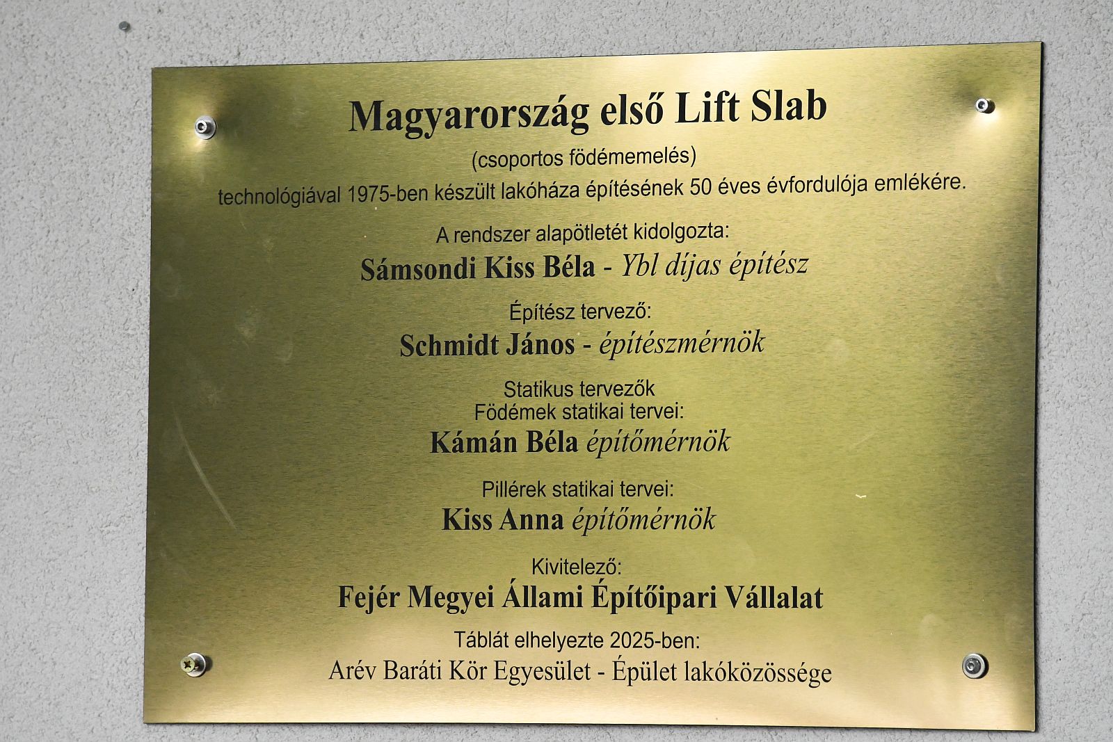 A ház falára elhelyezett emléktáblát Földi Zoltán és Kiss Lajos, az ARÉV Baráti Kör Egyesület elnöke leplezte le, akitől azt is megtudtuk, a Lift Slab technológiával mintegy 800 további fehérvári lakást épített később az ARÉV.