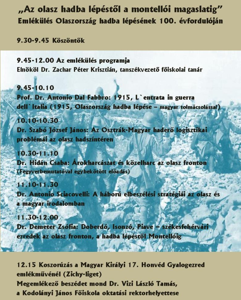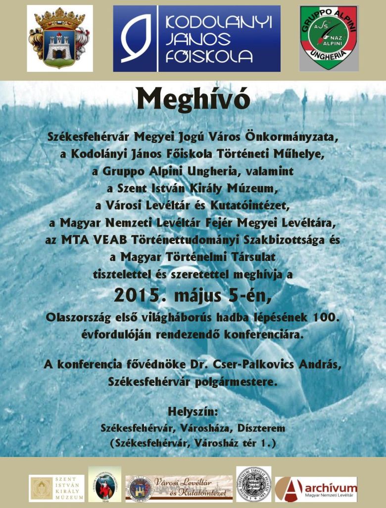 2015. május 5-én Székesfehérvár Megyei Jogú Város Önkormányzata, a Kodolányi János Főiskola Történeti Műhelye, a Gruppo Alpini Ungheria, valamint a Szent István Király Múzeum, a Városi Levéltár és Kutatóintézet, a Magyar Nemzeti Levéltár Fejér Megyei Levéltára, az MTA VEAB Történettudományi Szakbizottsága és a Magyar Történelmi Társulat nemzetközi emlékkonferenciával emlékezik meg Olaszország első világháborús hadba lépésének 100. évfordulójáról. A konferenciára, melynek fővédnöke Dr. Cser-Palkovics András, Székesfehérvár polgármestere, a Városháza Dísztermében kerül sor. A rendezvény során Prof. Dr. Antonio Dal Fabbro és Dr. Antonio Sciacovelli olasz szemszögből ismertetik az eseményeket. Dr. Szabó József János az olasz fronton harcoló osztrák-magyar haderő problémáit, Dr. Hidán Csaba fegyverbemutatóval egybekötött előadásában az állóháború mindennapjait és Dr. Demeter Zsófia a székesfehérvári ezredek szerepét mutatja be Isonzótól egészen Montellóig.