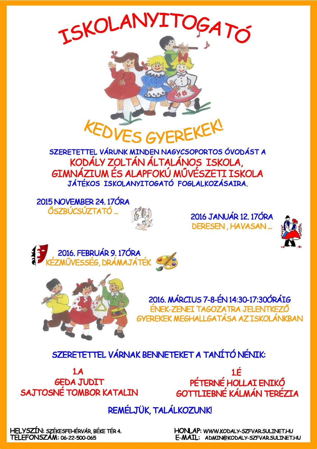 Ének-zenei meghallgatást tartanak a leendő ének-zenei tagozatos első osztályos tanulóknak a Kodály Zoltán Általános Iskola, Gimnázium és Alapfokú Művészeti Iskolában. Március 7-én és 8-án, hétfőn és kedden várják nagy szeretettel az énekelni, táncolni szerető nagycsoportos óvodásokat!