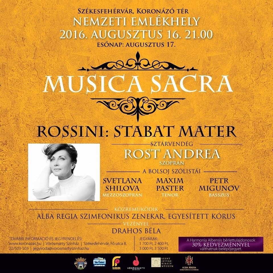 2016. augusztus 16-án, kedden 21 órakor a Nemzeti Emlékhelyen, a Nagyboldog- asszony-bazilika romjai felett, az ország legnagyobb épített szabadtéri színpadán lép fel Rost Andrea, a Kossuth- és Liszt Ferenc-díjas érdemes művész, valamint a Bolsoj vezető szólistái adják elő Rossini oratóriumát, a Stabat Matert. A produkcióhoz jelentkezőket várnak, akik csatlakoznának a 200 fős egyesített kórushoz.