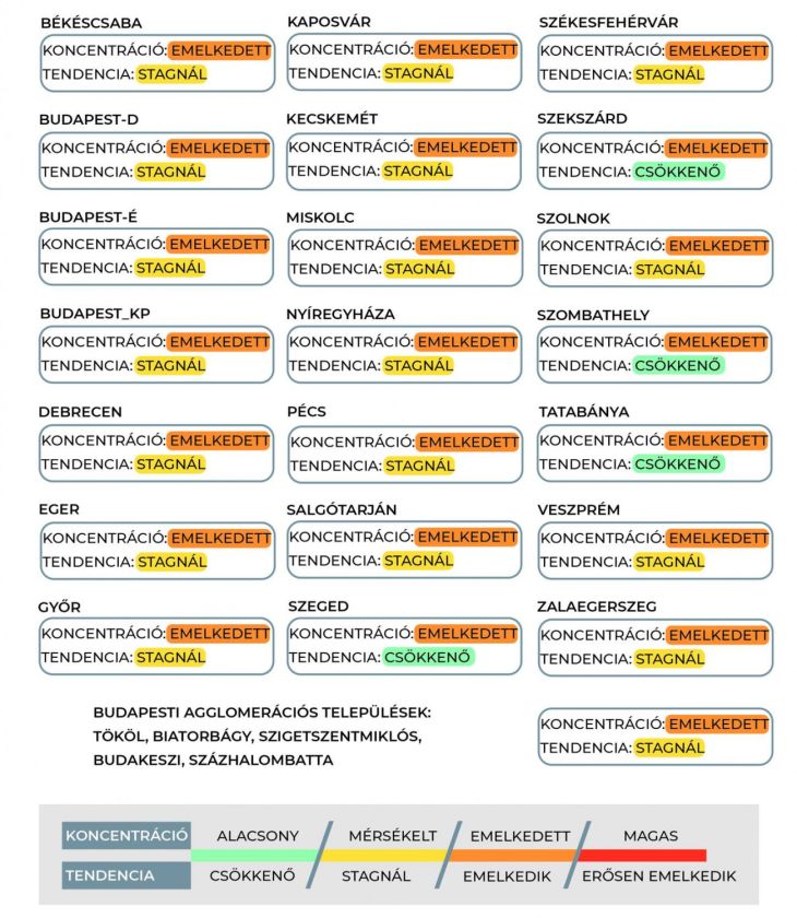Hozzátették: a koncentrációértékek csökkenése enyhe, egyelőre lassú ütemű, a mért értékek jelenleg az "emelkedett" koncentrációtartományba esnek.