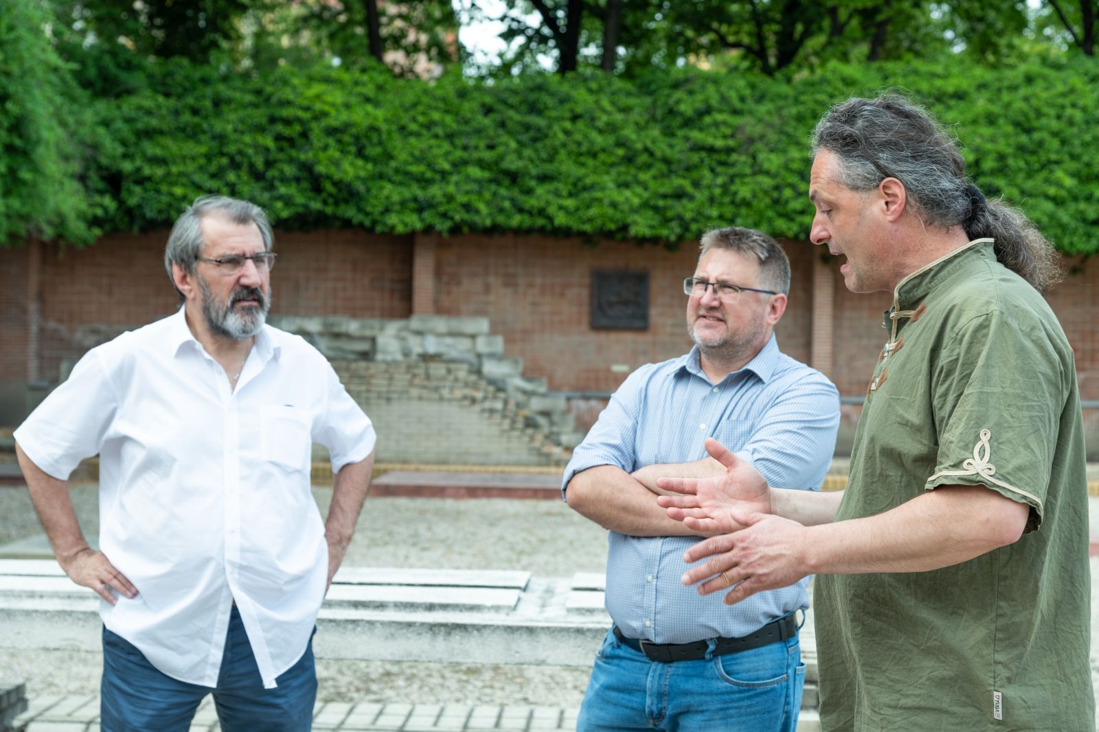 A Kossuth-díjas színművészt a látogatáson Szabados György történész kísérte, aki elmondta, hogy a Koronázó Bazilika Baráti Társaság egy civil kezdeményezés, amit székesfehérvári kötődésű patrióták, nemzeti elkötelezettségű, különböző szakterületeken tevékenykedő értelmiségiek hoztak létre: az alapítók között orvosok, ügyvédek, régészek és történészek is vannak. Céljuk, hogy a Nemzeti Emlékhely ügyét előremozdítsák és méltóbb körülmények alakulhassanak ki az egykori Koronázó Bazilika helyén.