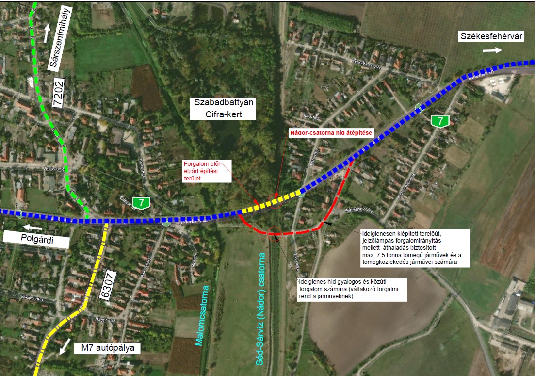 A személygépjármű forgalom és a 7,5 tonna össztömeget meg nem haladó teherforgalom a 7. számú főút 78+400 km szelvénye környezetében, Szabadbattyán belterületén a Sárvíz Nádor-csatorna területén kiépített terelőúton és ideiglenes hídon keresztül 1 sávon, váltakozó irányban, jelzőlámpás irányítás mellett haladhat. A megnövekedett menetidő és torlódások következményeinek elkerülése érdekében az Úrhida felé közlekedőknek, a 7202. és a 7201. számú utat vagy az M7-es autópályát célszerű igénybe venni.