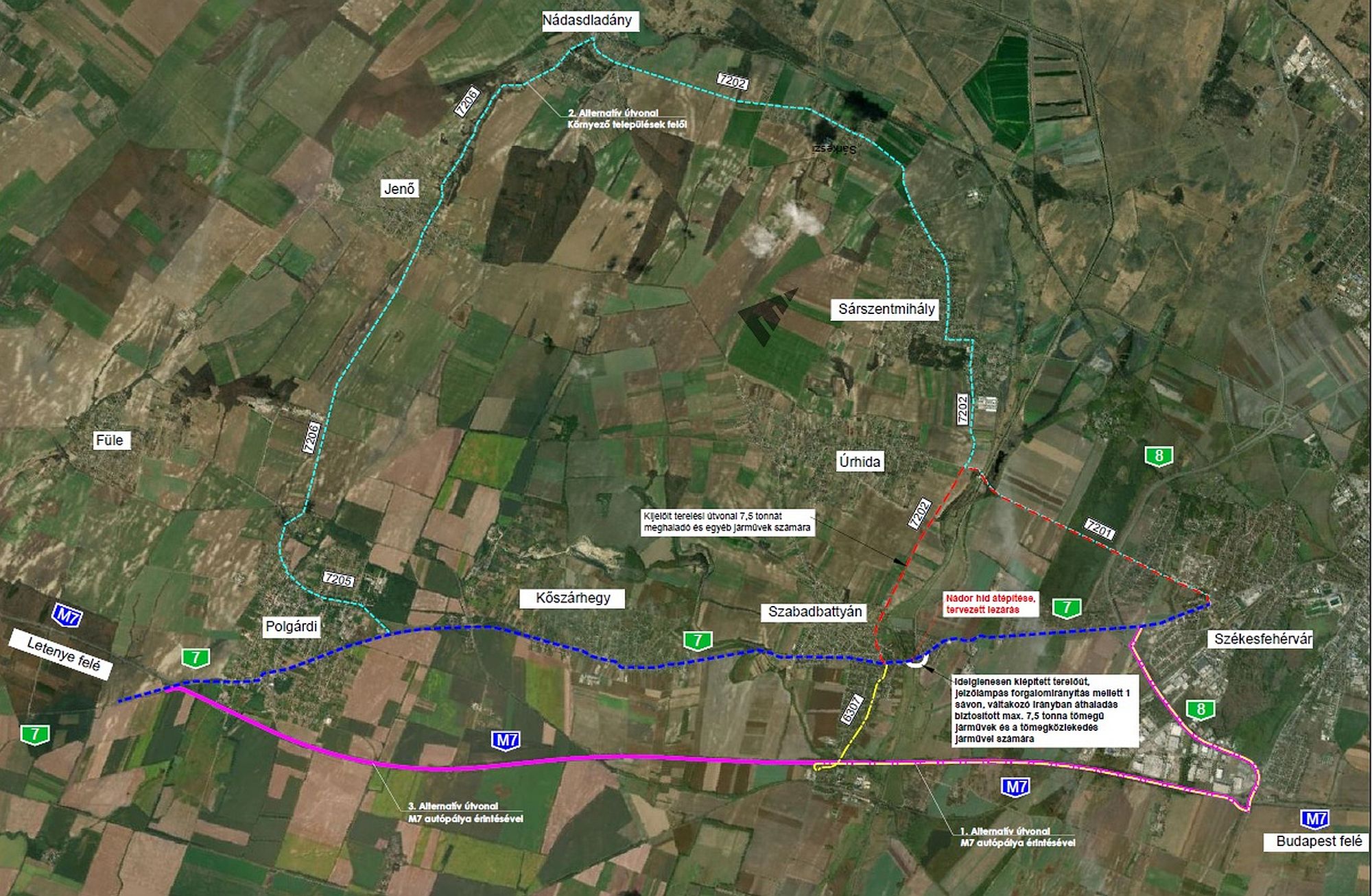 Székesfehérvár irányából a 7,5 tonna össztömeget meghaladó járműveket az úrhidai körforgalomnál Úrhida felé terelik el (7201. számú út), majd Szabadbattyán felé fordulva (7202. számú út) térhetnek vissza a 7. számú főútra.