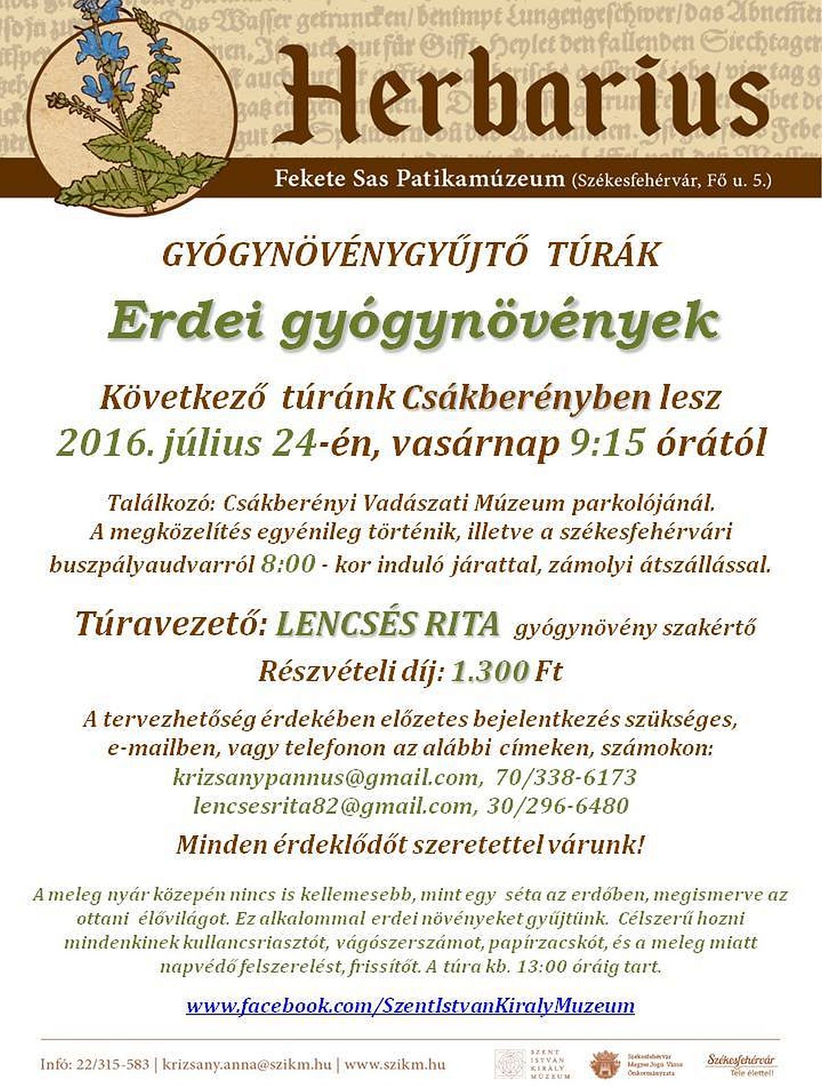 Egy kellemes séta keretében erdei növények gyűjtésére, az élővilág megismerésére indul július 24-én, vasárnap a Herbarius program, ezúttal Csákberénybe. A túrát Lencsés Rita gyógynövényszakértő vezeti: „A kis erdei tanösvényen haladva megfigyelhetjük az erdei növényeket. Mivel az eső nagyon jót tett a növényvilágnak, minden bizonnyal találunk majd apróbojtorjánt, orbáncfüvet, mezei zsályát, katángkórót, ökörfarkkórót, kígyósziszt, cickafarkot, útifűleveleket, nagy bojtorjánt, erdei gyömbért, tövises iglicét, iringót, csalánt és vérehulló fecskefüvet is.” A túrán ajánlott a kullancsriasztó, a gyűjtéshez való vágószerszám, papírzacskó, valamint a napvédő felszerelés és a frissítő.