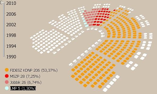 Az országgyűlési választások első fordulójának eredményei, 99 százalékos feldolgozottság szerint a Fidesz elsöprő többségét hozták. 64 százalékos részvétel mellett 119 választókerületben érvényes és eredményes végeredmény született. A Fideszre összesen 2 666 727 választó szavazott, ami 52,76 százalékot és 87 mandátumot jelent listáról, 119-et pedig egyéniben, azaz összesen már most 206 mandátumuk van a 386 fős törvényhozásban.