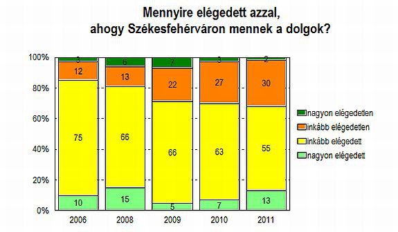 A városi közhangulat egyik fokmérője, hogy mennyire elégedettek a lakosok azzal, ahogy Székesfehérváron „mennek a dolgok”. Ezzel kapcsolatban a válaszolók 13 százaléka nagyon, további 55 százaléka inkább elégedett, kritikusabb véleményt egyharmaduk fogalmazott meg.