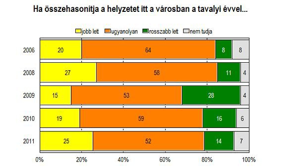 A város tekintetében az előző évekkel összehasonlítva a lakosok fele nem lát érdemi változást, szerintük ugyanúgy mennek a dolgok, ezek aránya évről évre nagyjából állandónak tekinthető. Azok, akik szerint idén jobban mennek a város ügyei mit egy évvel korábban, a minta 25 százalékát teszik ki, míg az ellenkező póluson 14 százalékuk található. 2010-hez képest e kérdésben is határozottabb pozitív elmozdulás tapasztalható.