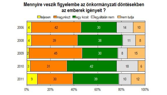 Arra a kérdésre, hogy mennyire veszik figyelembe az önkormányzati döntésekben az itt élő emberek igényeit szintén pozitív elmozdulás mérhető. A lakosok 9 százaléka mondta idén, hogy teljesen és további 30 százalék válaszolt inkább igennel, szemben a tavalyi 3 illetve 31 százalékkal.