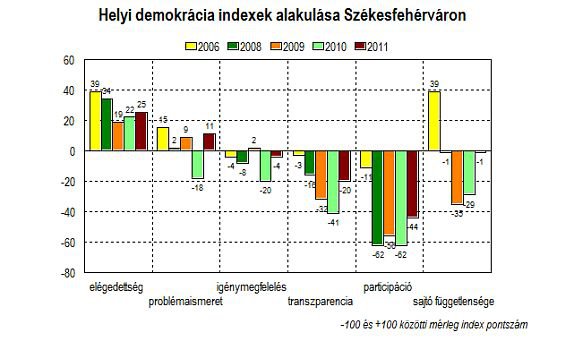 A helyi demokrácia helyzete más településekhez képest a tavaly megkérdezettek közel negyede szerint volt jobb Székesfehérváron, idén viszont már 51 százalékuk véli így, a pozitívan nyilatkozók aránya 23 százalékponttal nőtt egy év alatt.