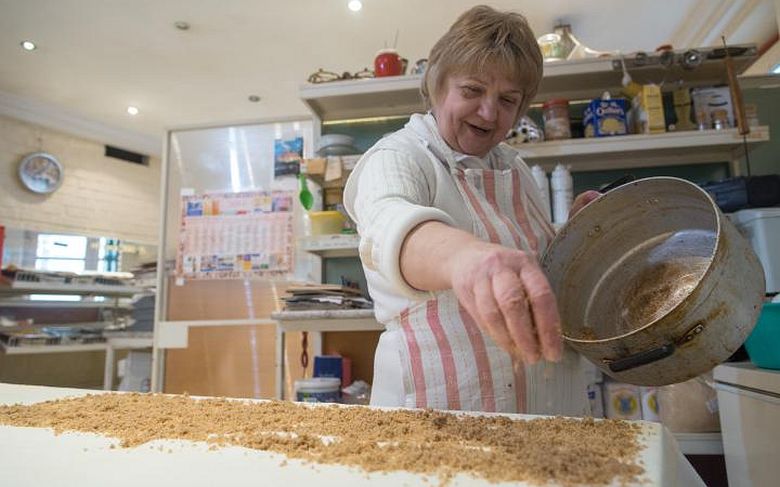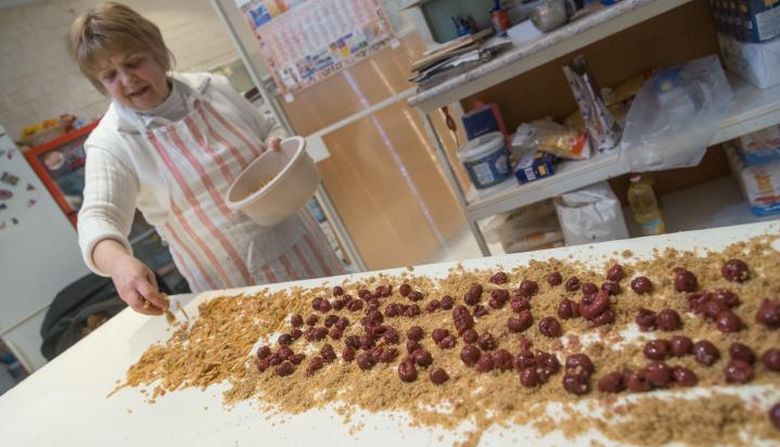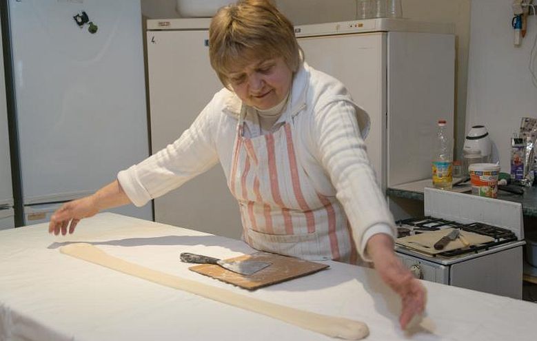 Közben előkerült a patyolatfehér lenvászon, amit több mint húsz évvel ezelőtt vásárolt egy orosz tanárnőtől. A terítőket éveken keresztül senki sem használta, az üzlet megnyitásáig a szekrény mélyén lapultak. Azóta viszont jó szolgálatot tettek, mert a régifajta, kemény vásznakat ma már szinte lehetetlenség beszerezni. Mikor a tészta készen állt a nyújtásra, Erzsi néni néhány határozott mozdulattal lisztet szórt az abroszra, alányúlt az első gombócnak, majd a pillangók szárnyrebegtetéséhez hasonló mozdulattal a levegőben hosszúkás alakúra húzta. A „fazonra alakítás” jól sikerült, hiszen a massza néhány határozott húzás után már az egész asztalt beterítette.