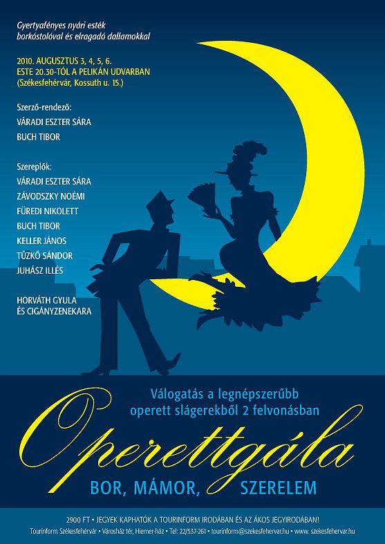 A "BOR, MÁMOR, SZERELEM" című Operettgála előadásai ezen a héten kedden megkezdődnek. Az időjárási előrejelzések szerint szükség lehet az esőhelyszín igénybevételére. Eső esetén az előadások a Művészetek Háza (Barátság Háza) emeleti színháztermében kerülnek megrendezésre. A hatalmas érdeklődés és az ennek nyomán megemelt nézőszám miatt az eredetileg esőhelyszínnek tervezett Zeneiskola terme kicsinek bizonyult, ezért vált szükségessé a módosítás.