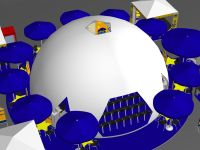 A gömbsátrat 12 csillag alakú asztal veszi körül, ahol a rendezvény partnerszervezetei – EUvonal, Europe Direct,
