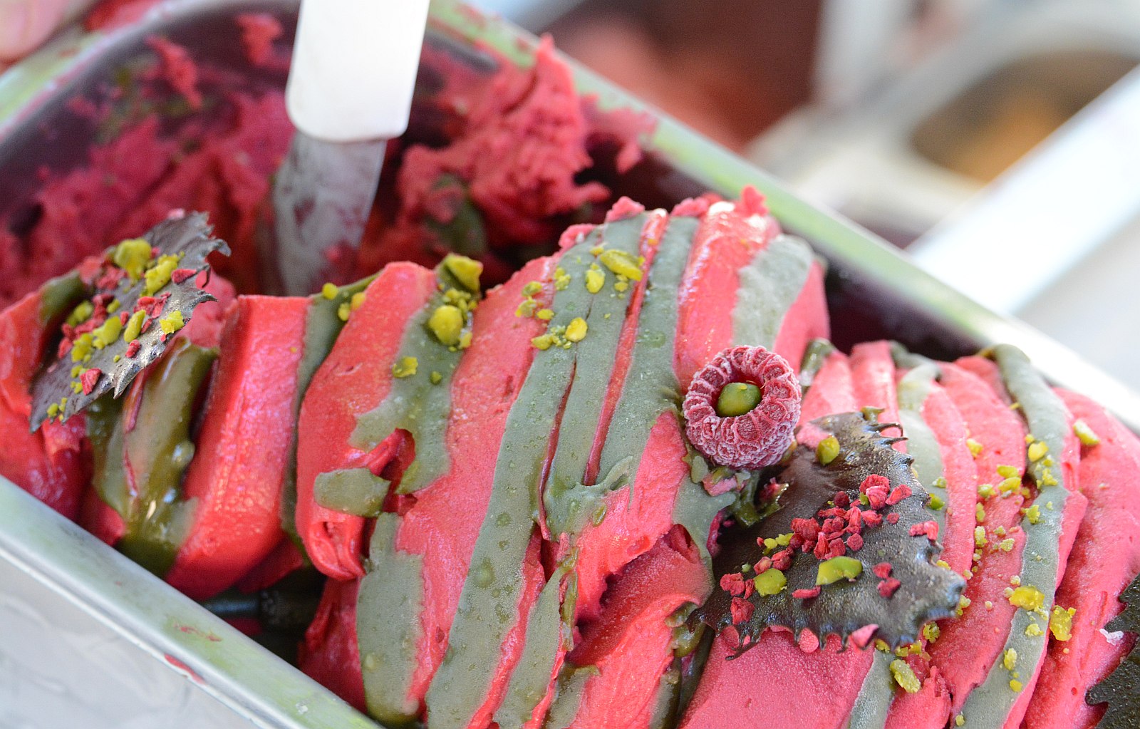 Így néz ki a fagyispultban a feketet teás málna bergamottal és pisztáciával.