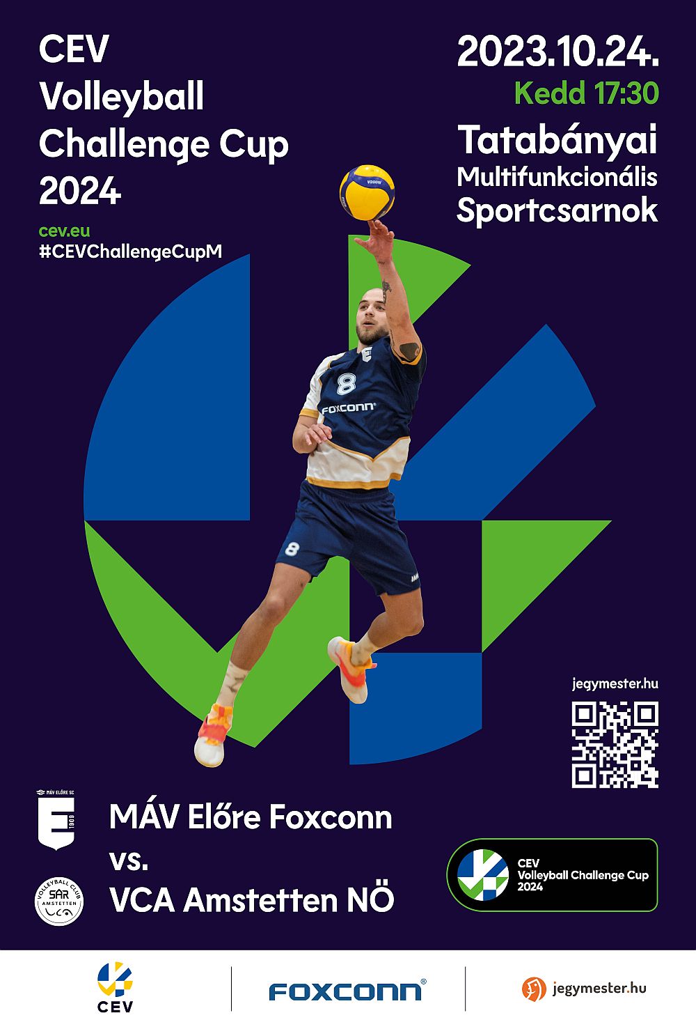A MÁV Előre Foxconn – VCA Amstetten NÖ nemzetközi férfi röplabda mérkőzést október 24-én 17:30 órakor rendezik, az összecsapást az M4Sport és az m4sport.hu élőben közvetíti. A magyarországi kupaeseményre a jegyértékesítés kizárólag online, a Jegymester.hu oldalon zajlik.