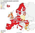 Az elmúlt héten további országok jelentettek csökkenő influenza aktivitást az Európai Betegségmegelőzési és Járványügyi Központnak (ECDC), így összességében csökkenni kezdett az influenza járványos terjedése Európában. Hat országban, köztük Magyarországon is azonban nőtt a megbetegedések száma. Az influenzajárvány még mindig földrajzilag kiterjedt az Unió 19 országában, köztük a szomszédos Ausztriában, Szlovéniában, és ebben a szezonban első alkalommal Romániában is. Hat országban (Bulgária, Finnország, Németország, Görögország, Magyarország és Románia) nőtt, tizenháromban változatlan maradt, kilencben pedig csökkent az influenzaszerű tünetekkel orvoshoz fordulók száma.