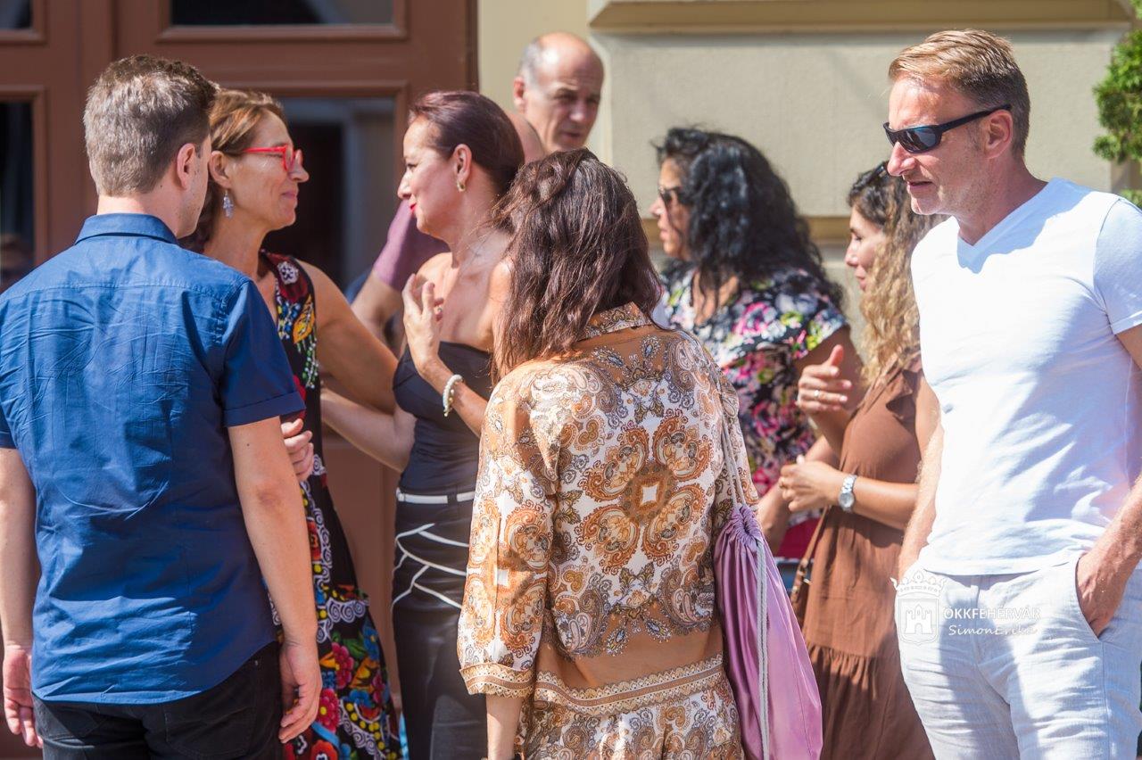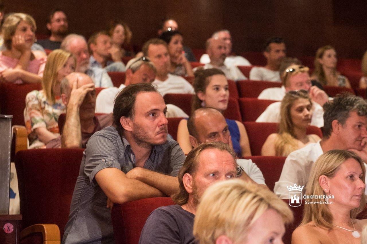Závodszky Noémi a kezdetektől, 25 éve tagja a Vörösmarty Színház társulatának, a színésznőt virággal köszöntötte Szikora János színházigazgató és Cser-Palkovics András polgármester.