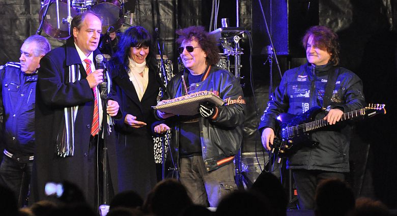 Meglepetésként ért mindenkit, hogy a koncert vége felé Székesfehérvár nevében Égi Tamás alpolgármester és felesége Östör Annamária öreghegyi önkormányzati képviselő a színpadon köszöntötte a december 21-én 67. születésnapját ünneplő művészt.