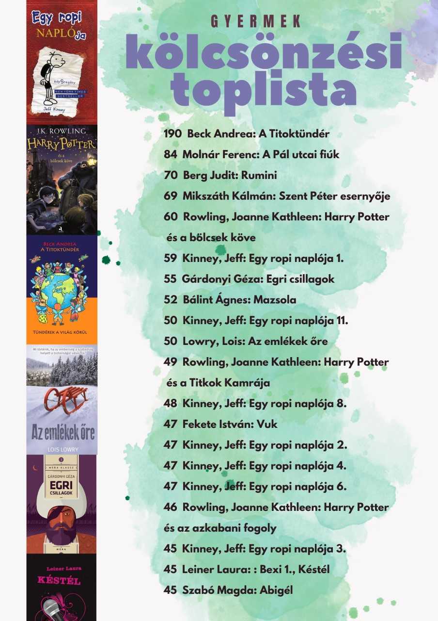 A gyermekeknek szóló kötetek között Beck Andrea Titoktündérje magasan a legnépszerűbb választás volt, 190 kölcsönzésével Molnár Ferenc Pál utcai fiúk című művét előzte meg. A dobogó harmadik fokára a tavalyi lista első helyezettje, a Rumini című Berg Judit-kötet ért oda, 70 kölcsönzéssel. Az örök klasszikus Harry Potter-sorozat számára új kihívó érkezett: Jeff Kinney Egy ropi naplója című 16 részes könyvsorozata. Ez nemzetközi bestsellerként a fiatalok egyik legkedveltebb könyve. Nagybetűs formátumával, rövid mondataival és a kézíráshoz hasonló betűivel azt a hatást kelti, mintha egy valódi naplót forgatna az olvasó.