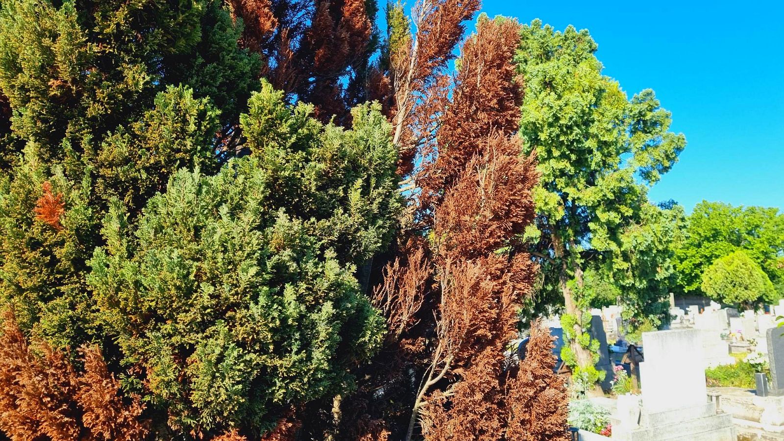 A Csutora temetőben készült kép jobb és bal oldalán is jól látszik, hogy a nyugati tuja, sűrűbb lombozatával nem bírja a klímánkat, míg a hamisciprusok idős példányai (a képen középen), a szellősebb lombozatukkal még viselik a nyári hőhullámokat.