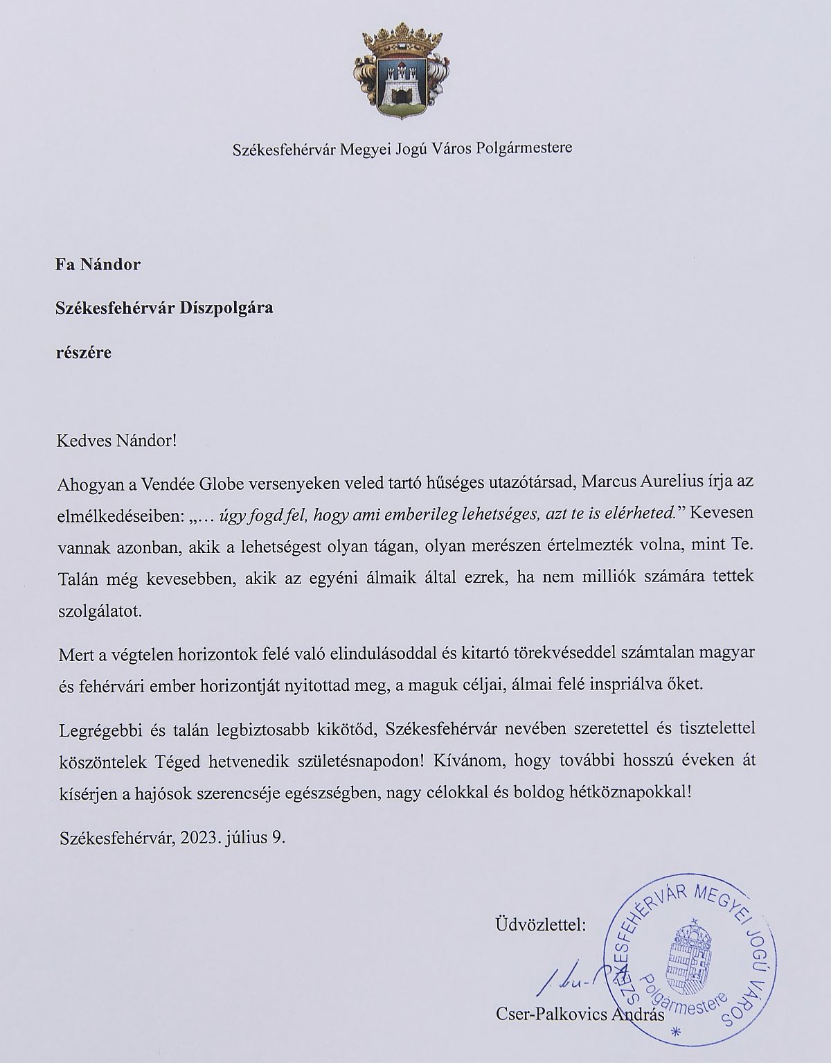 Az ünnepeltet dr. Cser-Palkovics András polgármester is felköszöntötte, aki levelében így üzent a 70 éves legendának: a végtelen horizontok felé való elindulásoddal és kitartó törekvéseddel számtalan magyar és fehérvári ember horizontját nyitottad meg, a maguk céljai, álmai felé inspirálva őket.
