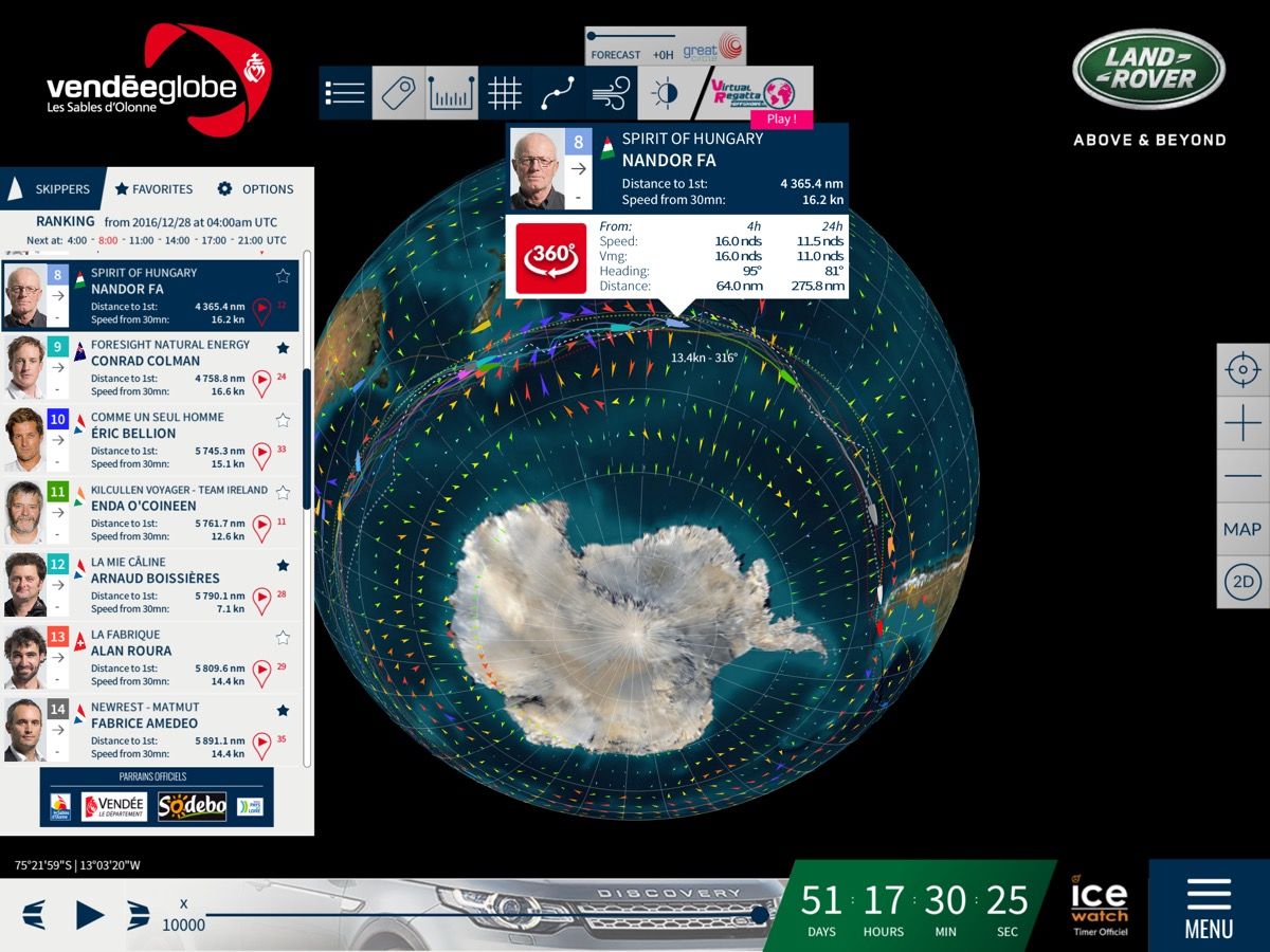 Csendes-óceáni karácsony “az esti alkonyat nem fordul át éjszakába, hanem az Antarktisz fölött körbejár, és újra kivilágosodik” … Paul Meilhat. Sajnálom, nagyon fegyelmezetten vágtattak elöl Jérémie Beyou-val” - írja hajónaplójában Fa Nándor, aki a végtelen kékségben tölti az év utolsó napjait a Spirit of Hungary fedélzetén és a nyolcadik helyen áll a Vendée Globe verseny 51. napján.