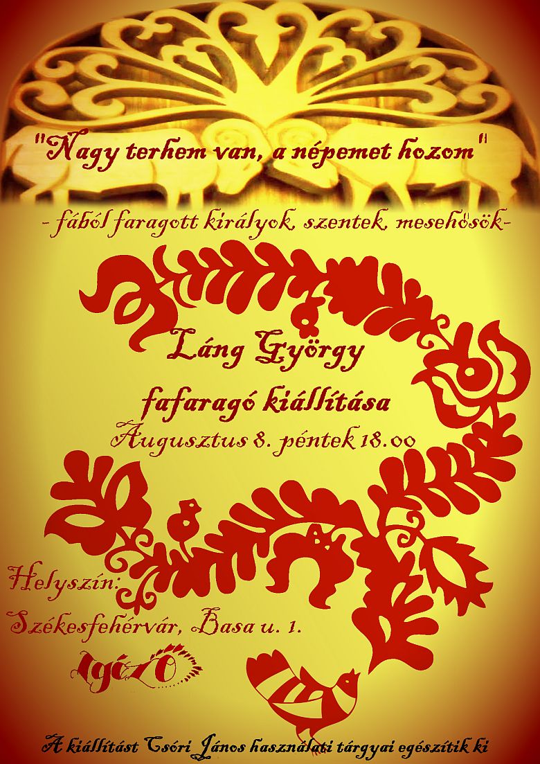 "Nagy terhem van, a népemet hozom" - fából faragott királyok, szentek, mesehősök címmel új kiállítás nyílik augusztus 8-án, péntek este, a székesfehérvári Igézőben. Láng György fafaragó munkáit a népmesékből, legendákból ismert királyok, szentek mesehősök ihlették. Láng György fafaragó kiállítása, pénteken 18.00-kor az esti mesét követően nyílik meg a látogatók előtt, és egész hónapban ingyenesen látogatható lesz.