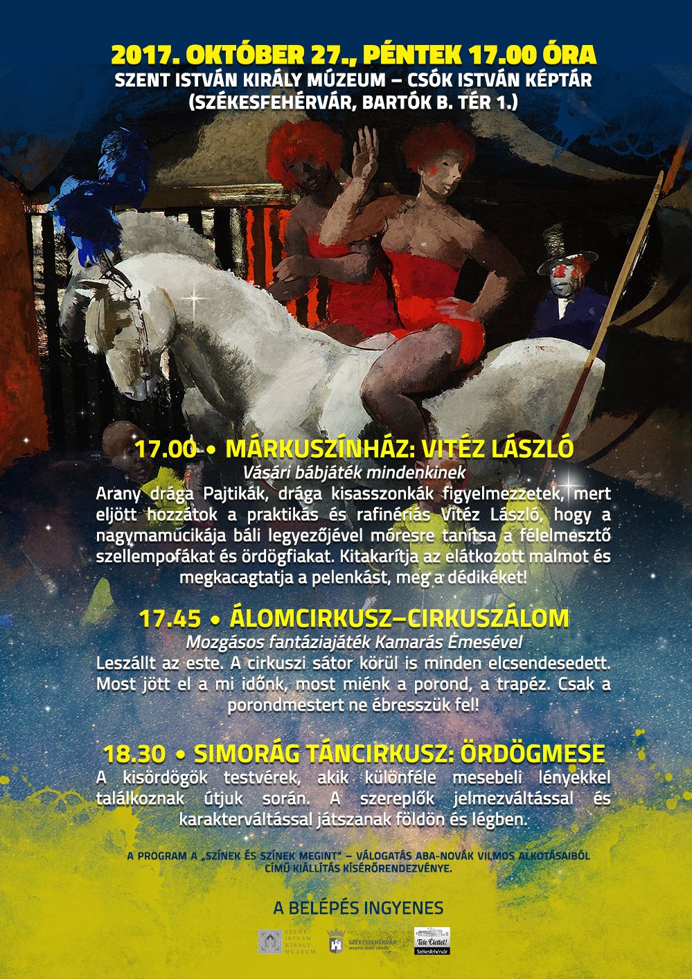 Október 29-ig látható az Aba-Novák kiállítás a Csók István Képtárban, a tárlat október 28-án és 29-én ingyenesen látogatható. A tárlat zárásához kapcsolódóan számos programot szerveznek a látogatóknak. Október 27-én pénteken bábjátékkal, fantázajátékkal és mesével várják a gyerekeket. Október 27-én péntek 17 órako a MárkusZínház adja elő a Vitéz László című vásári bábjátékot, majd 17.45-kor Álomcirkusz–cirkuszálom címmel mozgásos fantáziajátékot láthatunk Kamarás Emesével.