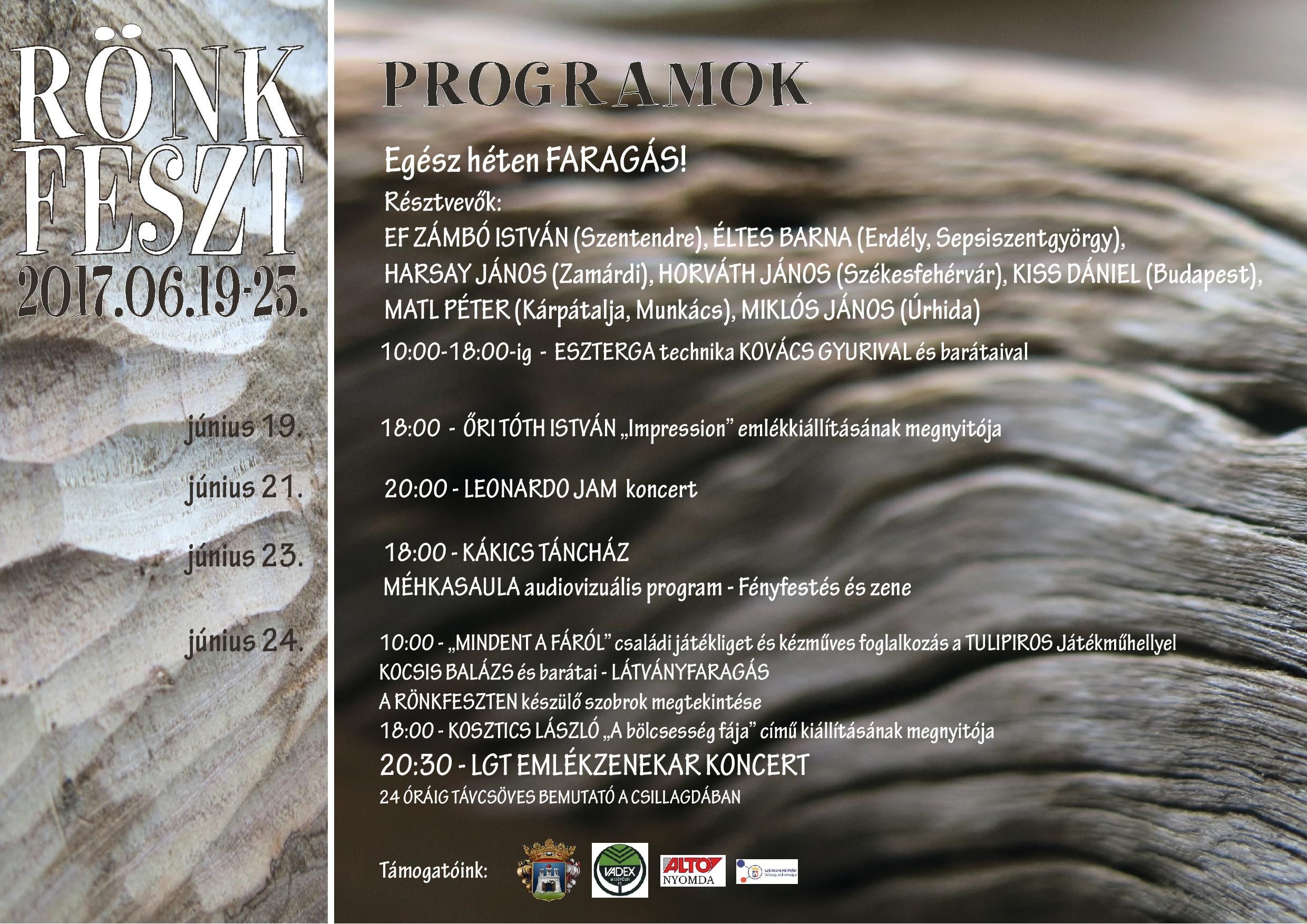 A faszobrász szimpózium nyitóeseménye lesz a június 19-én nyíló Őri Tóth-emlékkiállítás, a Múzeumok Éjszakája pedig a zárónap, amikor egész nap számos programmal várják a családokat. Többek között kézműves foglalkozások lesznek a Tulipiros Műhellyel, látványfaragás Kocsis Balázzsal és barátaival és fellép majd az LGT Emlékzenekar is. A fehérváriak egész héten találkozhatnak a Csónakázó-tó partján alkotó művészekkel, ef. Zámbó Istvánnal, Éltes Barnával, Harsay Jánossal, Kiss Dániellel, Matl Péterrel, Miklós Jánossal és a fehérvári Horváth Jánossal.