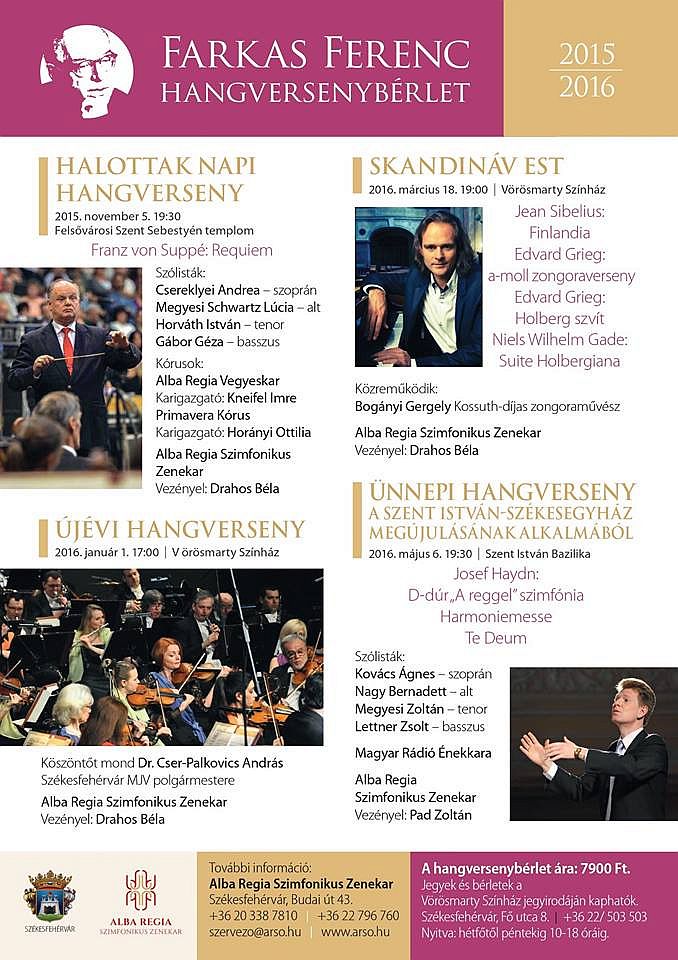 Hosszú idő után újra felnőtt hangversenybérlettel jelentkezik az Alba Regia Szimfonikus Zenekar. Az első koncertre november 5-én a Felsővárosi Szent Sebestyén templomban kerül sor, a Halottak napi hangversenyen Franz von Suppé Requiem című művét adják elő. A sorozat 2016 január 1-jén Újévi koncerttel folytatódik, ami vidám és elegáns műsort kínál. Március 18-án Skandináv est lesz Bogányi Gergely Kossuth- díjas zongoraművész közreműködésével, felcsendül Sibelius Finlandiája és Grieg Holberg svítje is. A hangversenysorozat 2016 május 6-án a megújult Bazilikában zárul, ahol Haydn Te Deuma, D-dúr "A reggel" szimfóniája és Harmoniemesse című műve hangzik el.