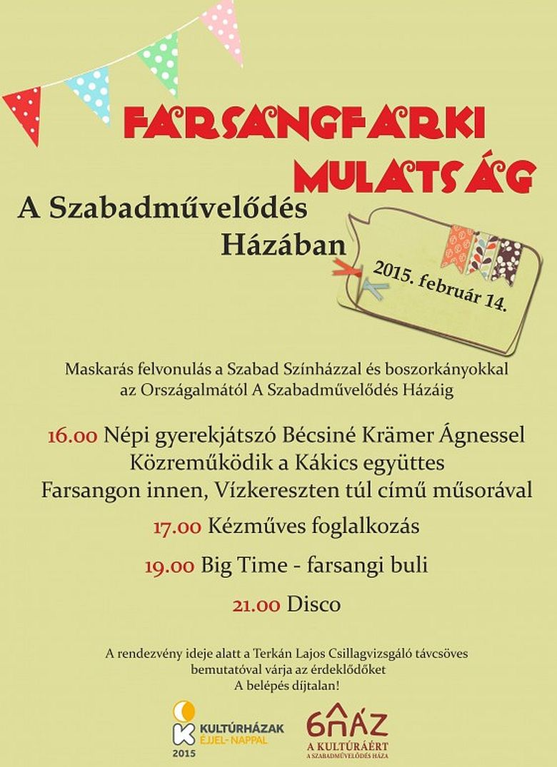 Farsangfarki mulatozásra várnak minden érdeklődőt A Szabadművelődés Házába február 14-én, délután 16 órától. Bécsiné Krämer Ágnes gyermekjátszójával indul a program, amelyen közreműködik a Kákics együttes, majd 17 órától kézműves foglalkozáson alkothatnak a gyerekek. 19 órától farsangi bulit is tartanak a Big Time-mal, a programot pedig diszkóval zárják.