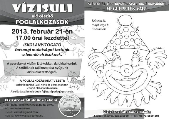 Február 21-én, csütörtökön 17 órai kezdettel folytatódik az Iskolanyitogató programsorozat a Vízivárosi Általános Iskolában. Ezúttal farsangi mulatságot szerveznek a végzős óvodásoknak, akiket vidám dalokkal, játékokkal vár a két leendő elsős tanító néni, Asbóth Imréné és Béres Mariann. Közben egy másik teremben Székely Judit fejlesztőpedagógus az iskolaérettségről tart előadást szülőknek.