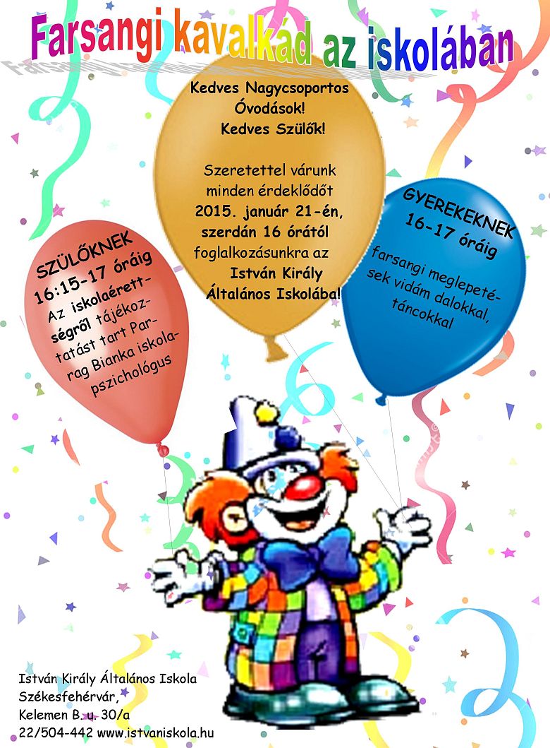 A leendő első osztályos gyerekeknek szerveznek farsangi mulatságot január 21-én, szerdán a Székesfehérvári István Király Általános Iskolában. A kavalkád 16 órakor kezdődik, a foglalkozás keretében farsangi meglepetésekkel, vidám dalokkal, táncokkal szórakoztatják a gyerekeket. 16.15 órától a szülőknek tart előadást az iskolaérettségről Parrag Bianka iskolapszichológus.