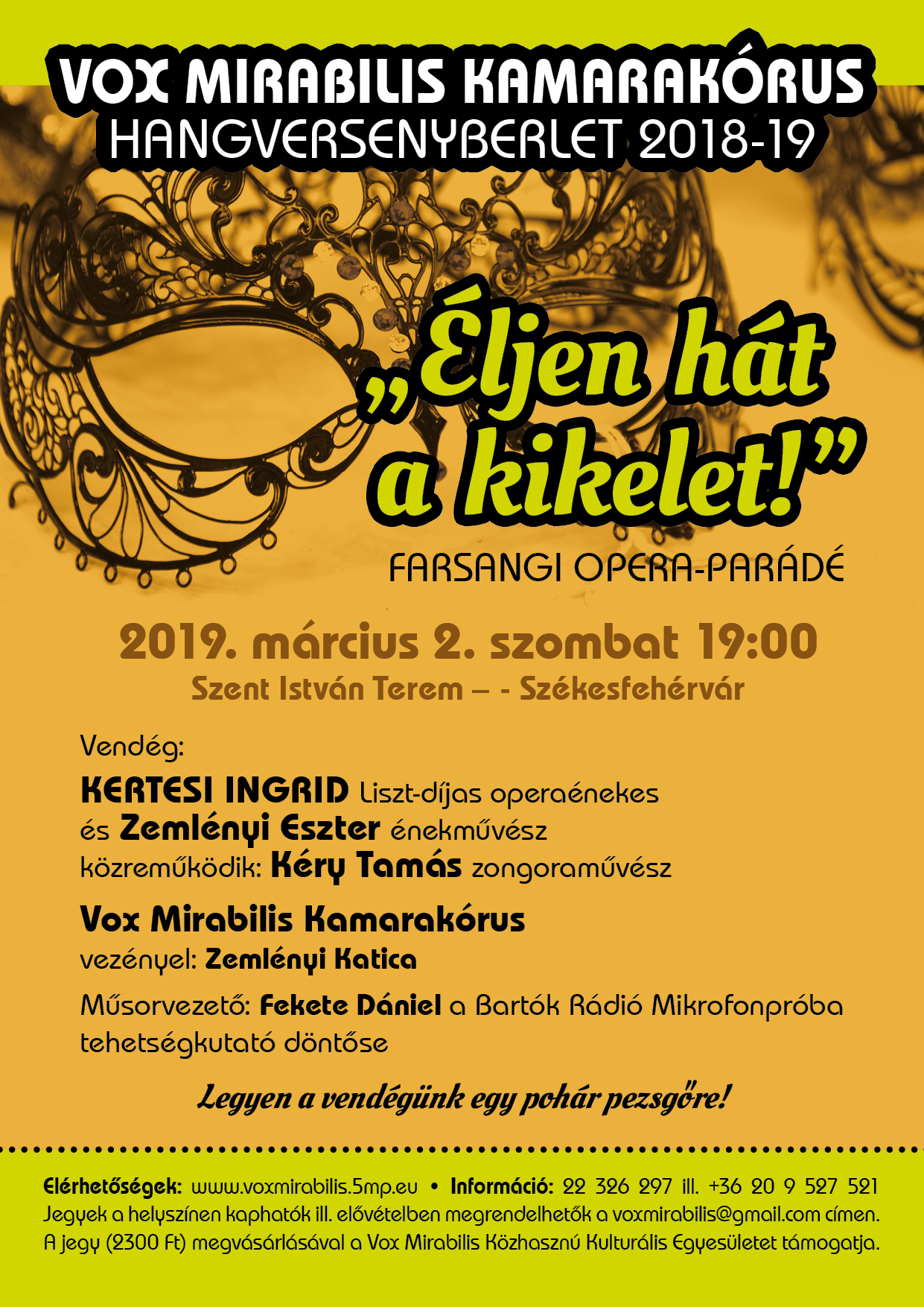 A Vox Mirabilis Kamarakórus 2018/19-es Hangversenybérletének „Farsangi opera-parádé” koncertjére kerül sor március 2-án, szombaton 19 órakor a Szent István teremben. A koncerten meglepetésekkel is készülnek a zeneszerető közönségnek.
