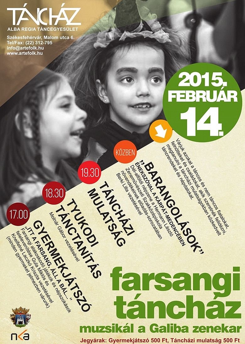 2015. február 14-én, szombaton Farsangi Táncházat szerveznek a Malom utca 6. szám alatt a Galiba zenekarral. A programra várnak minden olyan táncos és nem táncos fiatalt és felnőttet, akik szeretnék felidézni, megtanulni a táncházi mulatságokban közkedvelt táncrendeket és népdalokat. Az eseményen a gyermekjátszóban és a táncházi mulatságon is 500 Forintért lehet részt venni.