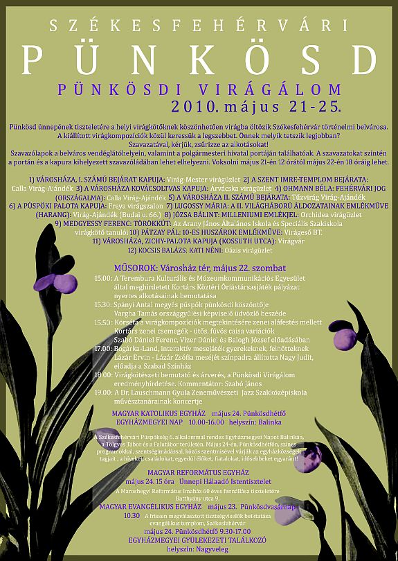 A várhatóan rossz időjárás miatt miatt a Szabad Színház Bogárka-Land című mesejátékát új helyszínen, a Polgármesteri Hivatal udvara helyett a Hermann László Zeneiskola nagytermében rendezik meg, május 22-én, szombaton 17 órakor. Ugyancsak fedél alá költöztetik a szombaton és vasárnap megrendezendő jazzkoncerteket, melyek a Városház tér helyett a Helyőrségi Klub színháztermében, változatlan időpontban lesznek megtekinthetőek, a Pünkösdi Virágálom keretein belül. A Székesfehérvári időjárás előrejelzés szerint szombaton viharos, vasárnap részben napos idő várható, helyenként záporokra lehet számítani.