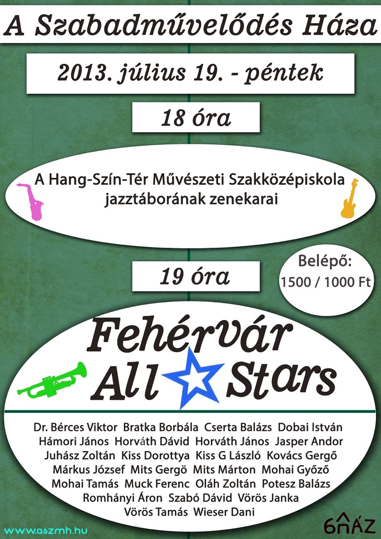 Július 19-én pénteken 18 órakor A Szabadművelődés Házában a Hang-Szín-Tér Művészeti Szakközépiskola jazztáborának zenekarai mutatkoznak be, majd 19 órától mestereik lépnek színpadra. Az All Stars csapatban többek között Mits Gergő, Mohai Tamás, Muck Ferenc, Romhányi Áron és Vörös Tamás lép fel.