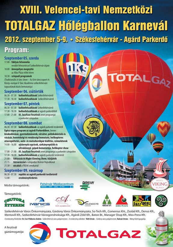 Ismét megrendezik a Velencei-tavi Nemzetközi TOTALGAZ Hőlégballon Karnevált szeptember 5-e és szeptember 9-e között. A rendezvénybe ezúttal bekapcsolódik Székesfehérvár is, a hőlégballonok legalább két alkalommal a város területéről szállnak fel. A versenyt 1992 szeptemberében rendezték meg először, az azóta eltelt 20 évben több mint 400 magyar és külföldi ballonos csapat fordult meg a tónál és nézte felülről Székesfehérvárt.