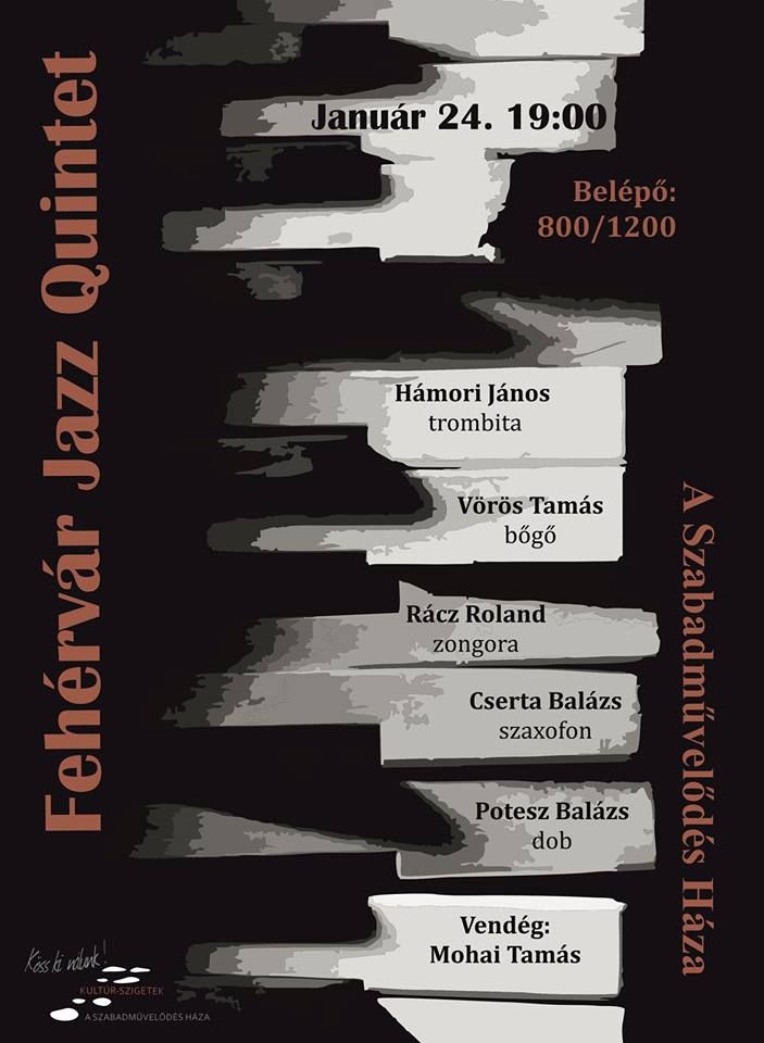 Január 24-én pénteken este hétkor a Szabadművelődés Házába várják a jazz kedvelő közönséget a Fehérvár Jazz Quintet koncertjére. A zenekar tagjai kincset érő fehérvári zenészek: trombitán Hámori János, bőgőn Vörös Tamás, zongorán Rácz Roland, szaxofonon Cserta Balázs játszik, a dobok mögött pedig Potesz Balázs adja ritmust. A koncerten vendégként Mohai Tamás is közreműködik.